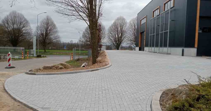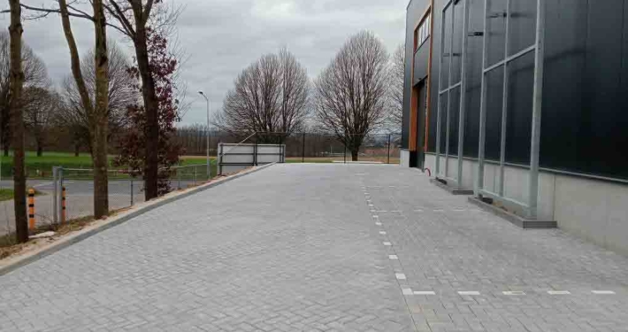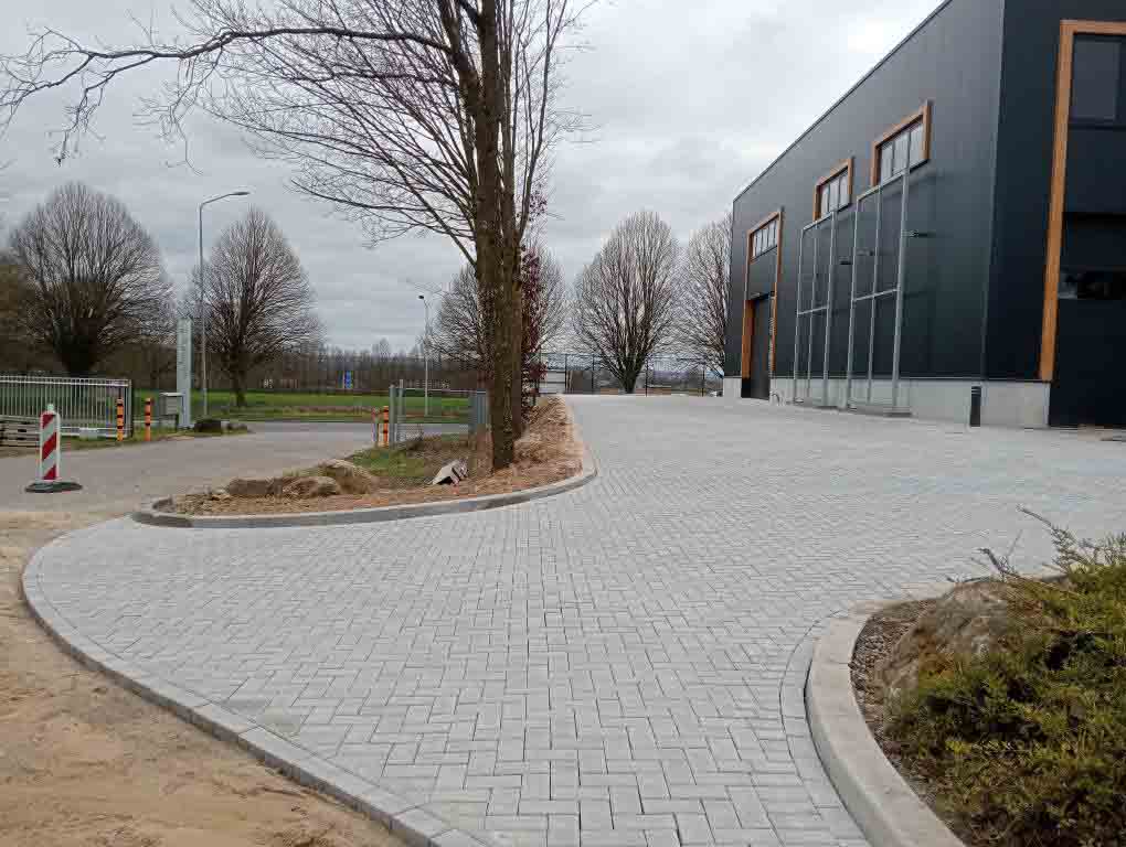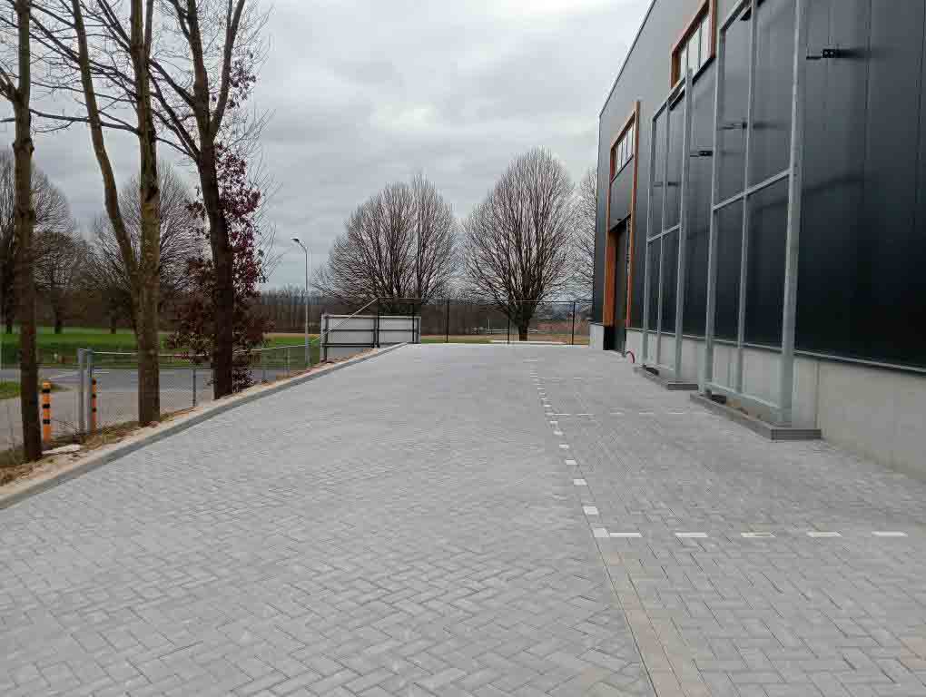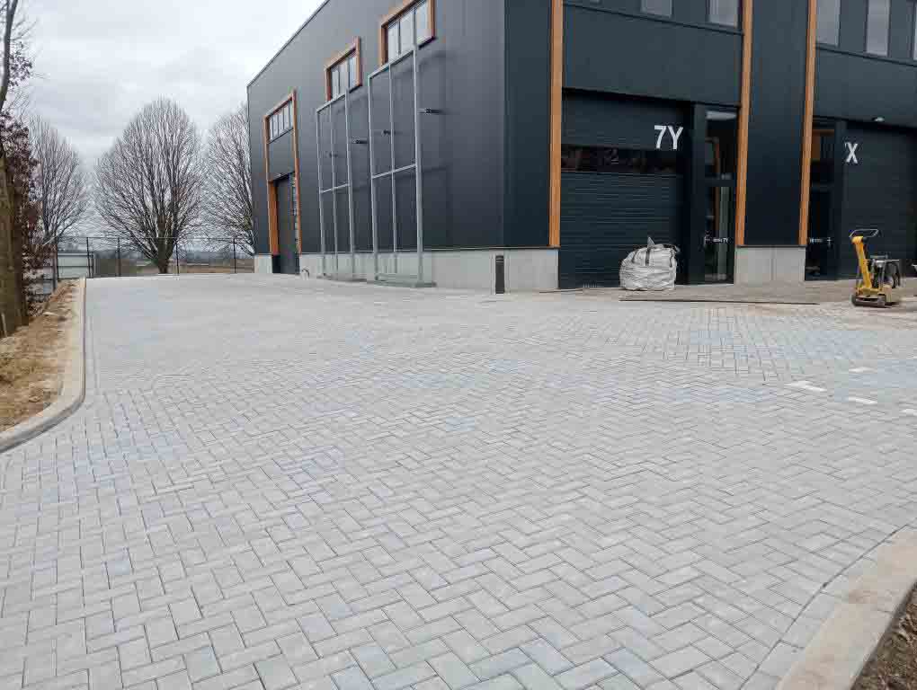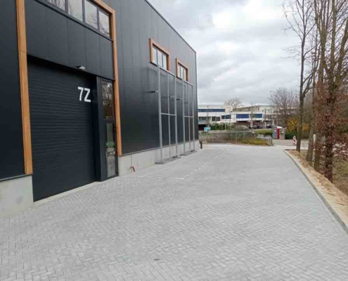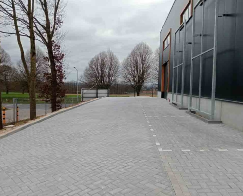Deze bestrating zorgt niet alleen voor een representatieve aanblik, maar ook voor praktische toegankelijkheid voor personeel, bezoekers of voertuigen.