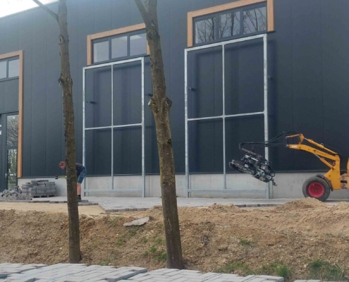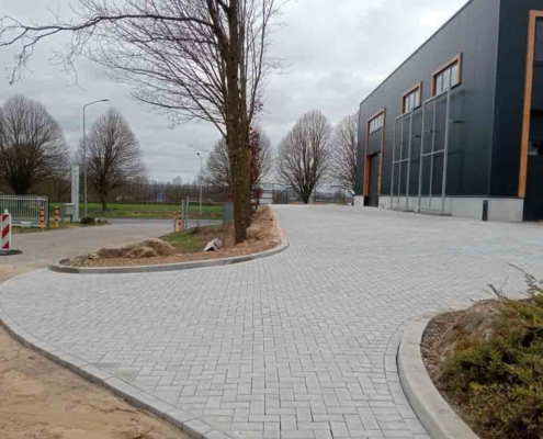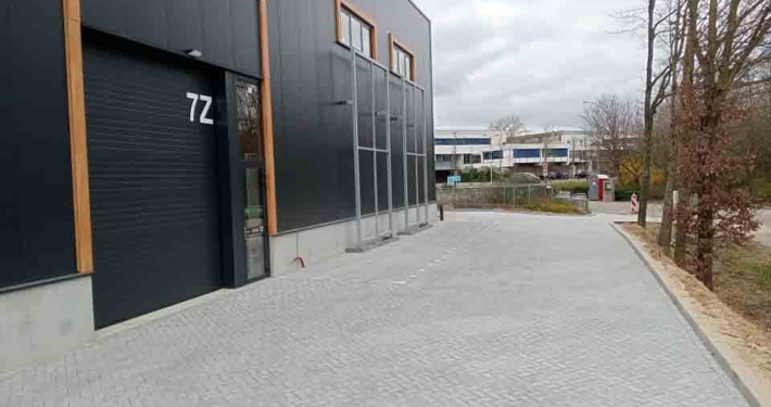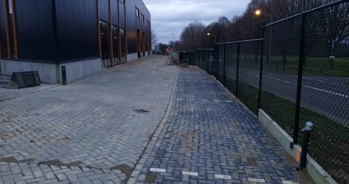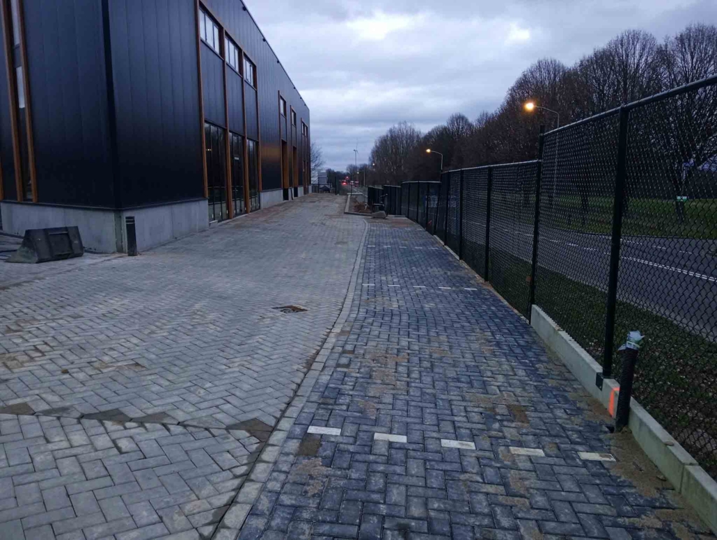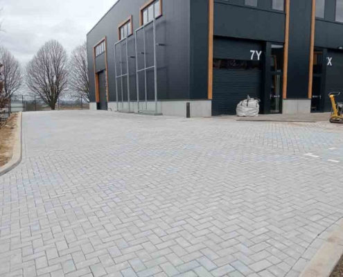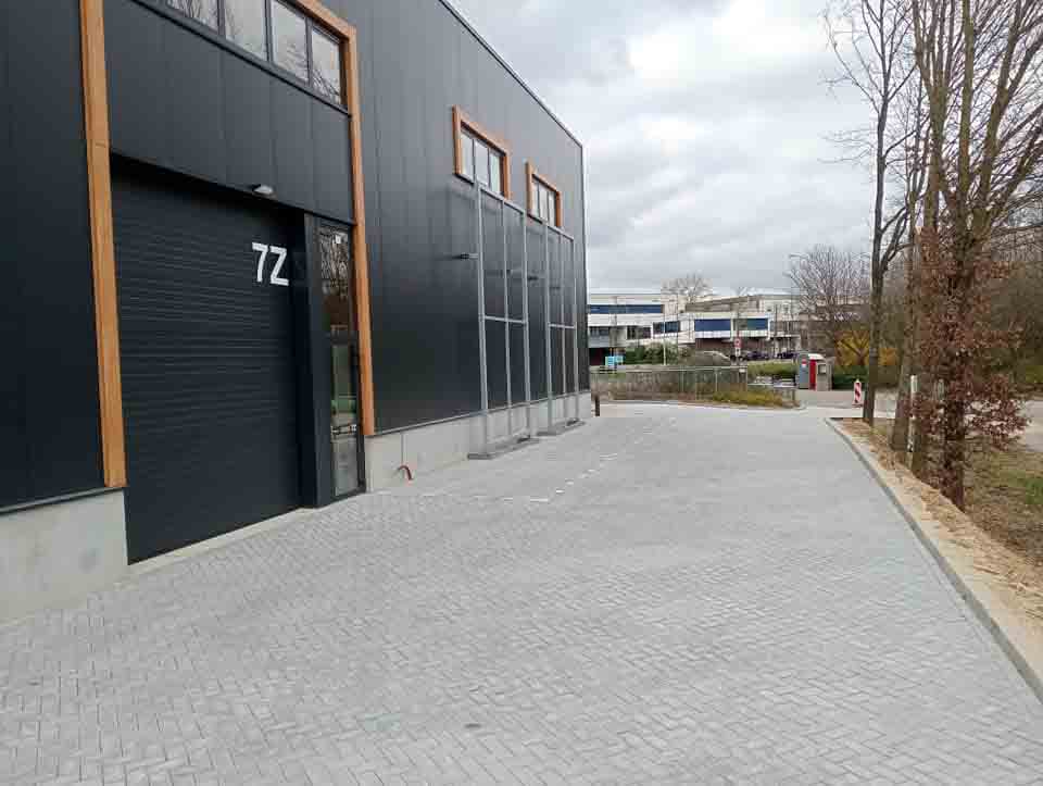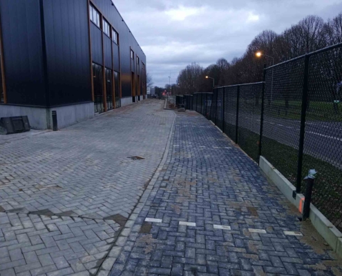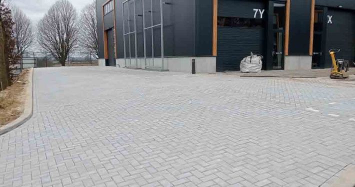 Deze bestrating zorgt niet alleen voor een representatieve aanblik, maar ook voor praktische toegankelijkheid voor personeel, bezoekers of voertuigen.